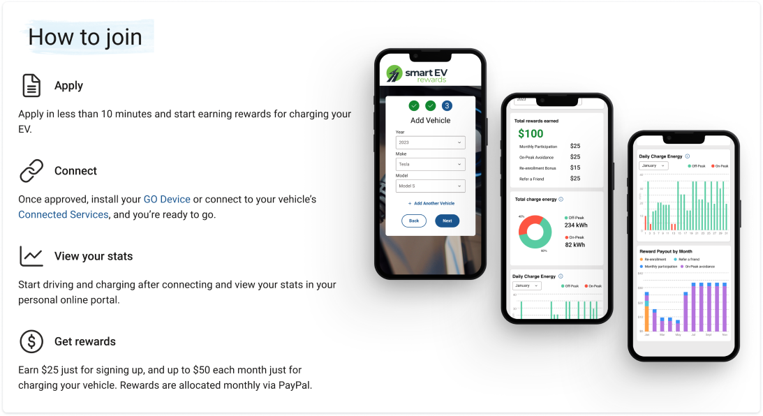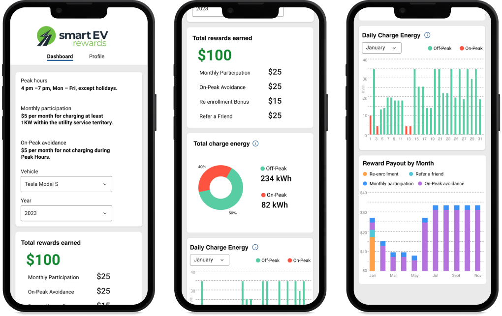 Participant dashboards provided a rich data visualization experience to engage users and help reinforce the desired behavioral change around EV charging. Program participants could utilize dashboards to track reward payout and monitor their daily and monthly charging trends. The end-to-end participant experience was designed to be fully responsive, with an emphasis on mobile views since most users would be engaging with the experience on their phones.