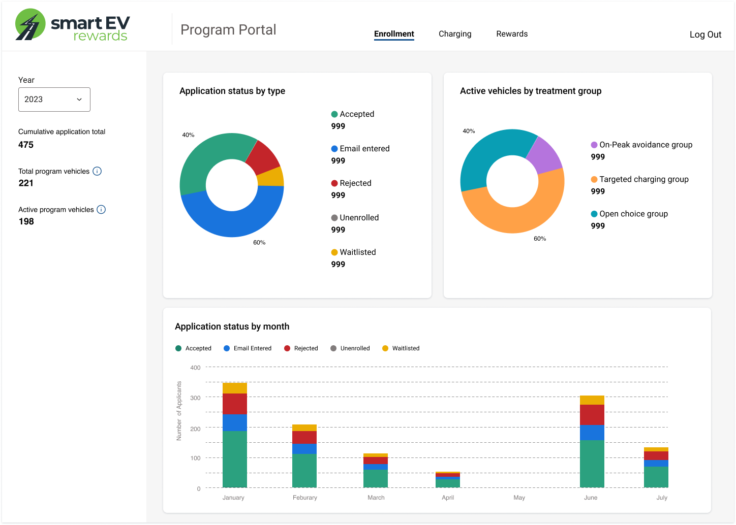 Utility program manager dashboards for managing participant enrollment, viewing trends in charging data, and comparing the efficacy of different treatment groups
